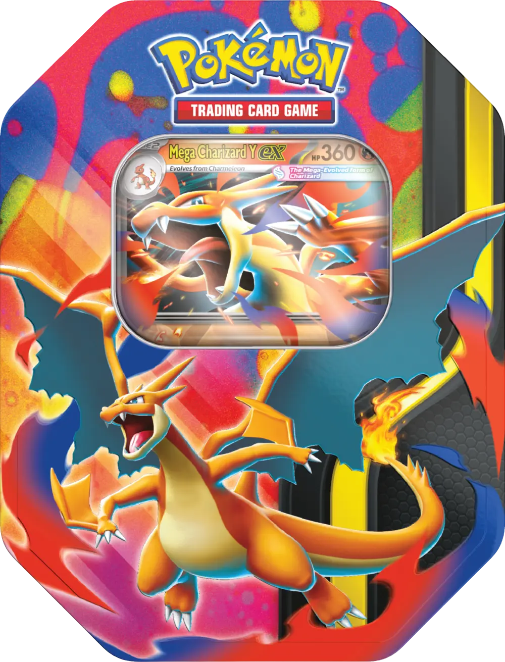 Pokémon TCG: Mega Charizard Y ex Tin to metalowa puszka kolekcjonerska zawierająca kartę promo Mega Charizard Y ex oraz 4 boostery Pokémon TCG. Idealny wybór dla fanów Charizarda i Mega Ewolucji, a także dla kolekcjonerów szukających efektownej karty promo i dodatkowych boosterów.